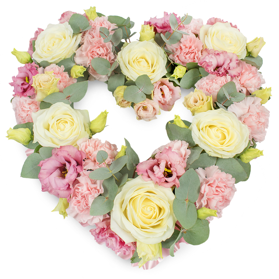 Show your deepest condolences with our Heartfelt Sympathy Floral Arrangement. This exquisite bouquet combines crisp white roses, gentle pink carnations, graceful pink lisianthus, and aromatic Eucalyptus leaves, arranged in a heartfelt open heart shape.